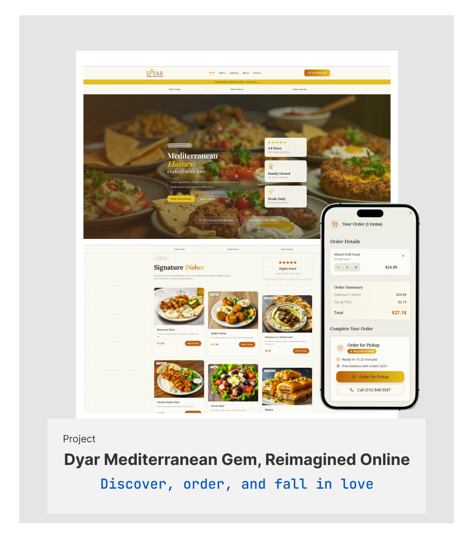 Modern website redesign brought a beloved Mediterranean restaurant closer to its community and boosted online orders by 35%.